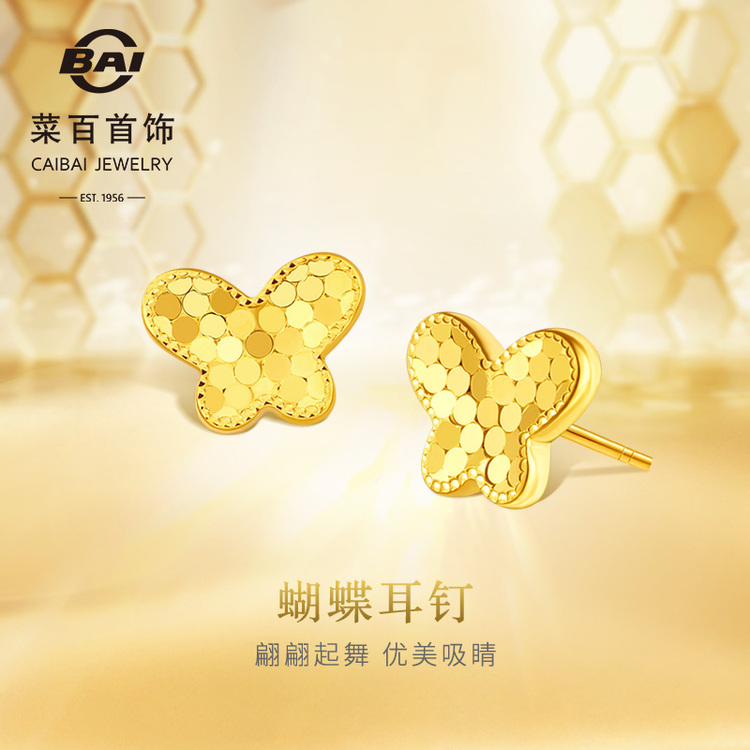 菜百首饰足金耳饰5G黄金时尚鱼鳞蝴蝶耳钉甜美蝴蝶直针耳饰女送礼