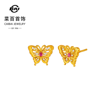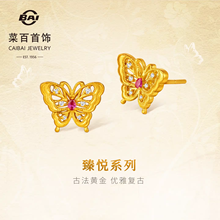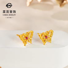 菜百足金耳饰臻悦系列古法黄金镶钻石红宝石蝴蝶耳钉甜美耳饰送礼