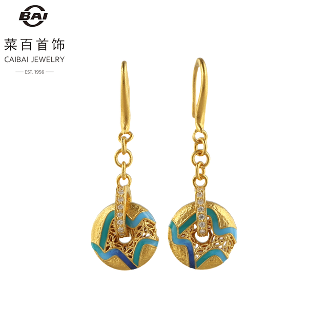 菜百首饰 黄金耳饰 足金古法鎏彩工艺家和祥瑞系列金韵青蓝耳坠