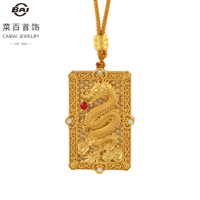 菜百首饰 黄金项坠 足金古法镶石工艺 家和祥瑞系列 御龙牌