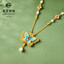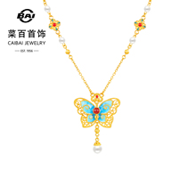 菜百足金项链东方花园蝶语系列古法黄金镶鎏彩蝴蝶项链