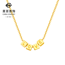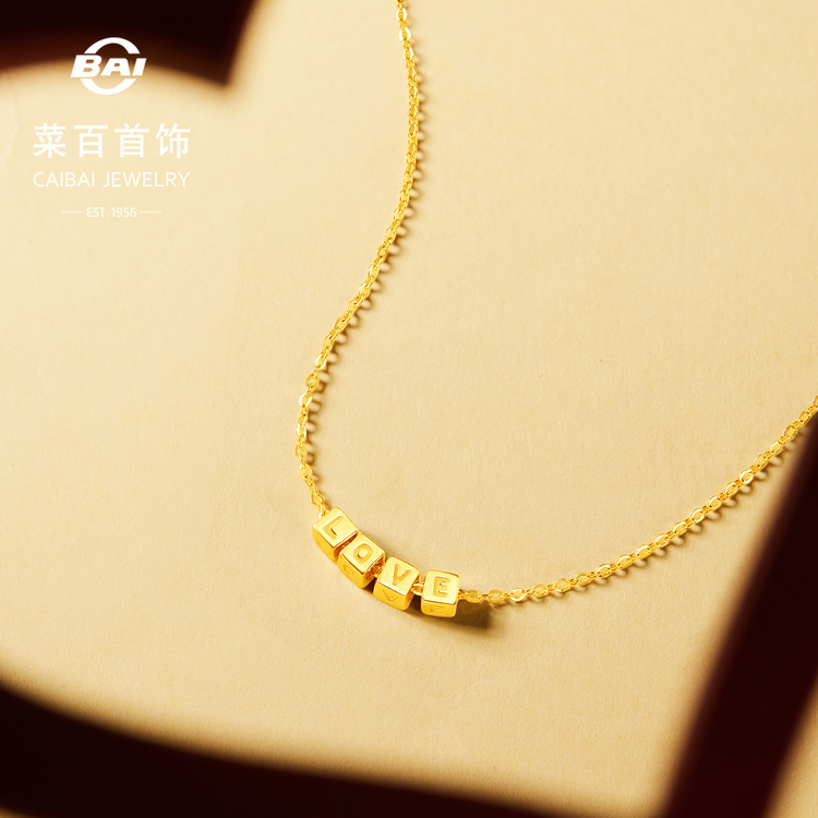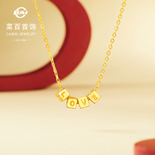 菜百首饰足金项链时尚闪耀金love字母锁骨链链牌趣味小方块项链女