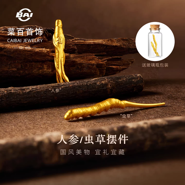菜百首饰足金摆件冬虫夏草黄金摆件国风药材饰品摆件宜礼宜藏