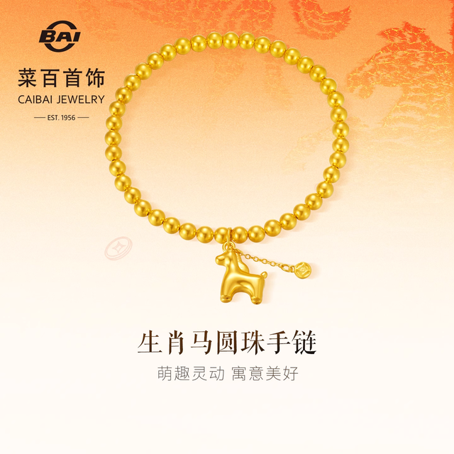 菜百首饰足金圆珠手链女新款黄金生肖马吊坠手串